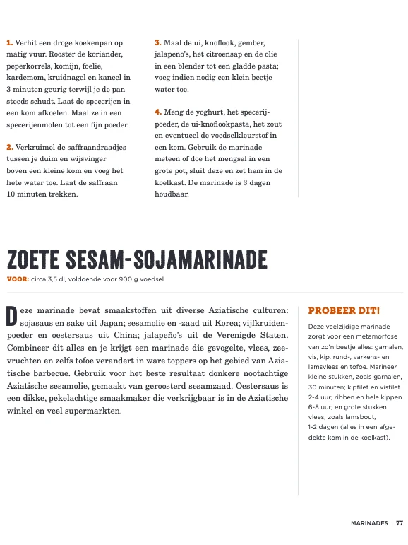 Steven Raichlen geeft je in zijn bestseller meer dan 200 recepten voor de allerbeste marinades, rubs en sauzen. Leer hoe je zuur, olie en smaken in evenwicht kunt brengen in een marinade, zodat het vlees mals blijft en aan de buitenkant die heerlijke explosie van smaken geeft. Wanneer gebruik je een natte marinade en wanneer kun je beter kiezen voor een droge rub? Wat zijn de voordelen van glazuren? Wanneer moet je vlees juist infuseren met smaken?