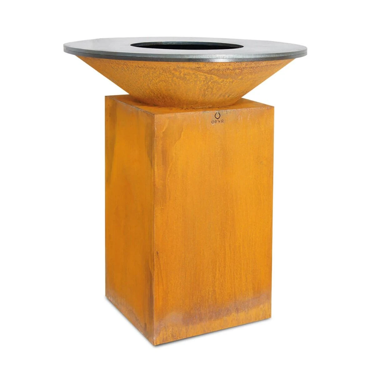 De OFYR is een vuurkorf, barbecue, kookplaat en plancha in één. In de centrale kegel stookt u met blokken haardhout een vuur dat de stalen ringvormige bakplaat heet genoeg opwarmt om er op te kunnen grillen, bakken en zelfs koken.