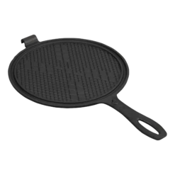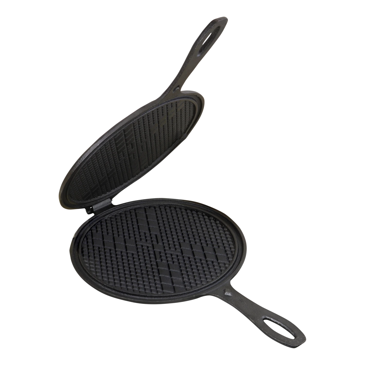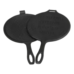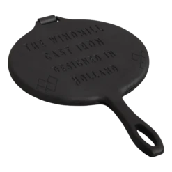 Gietijzeren stroopwafelijzer met handvat. Bestaande uit twee demontabele zijden. Tijdens het bakken eenvoudig om te draaien zodat de wafel aan beide zijden bruin wordt.
